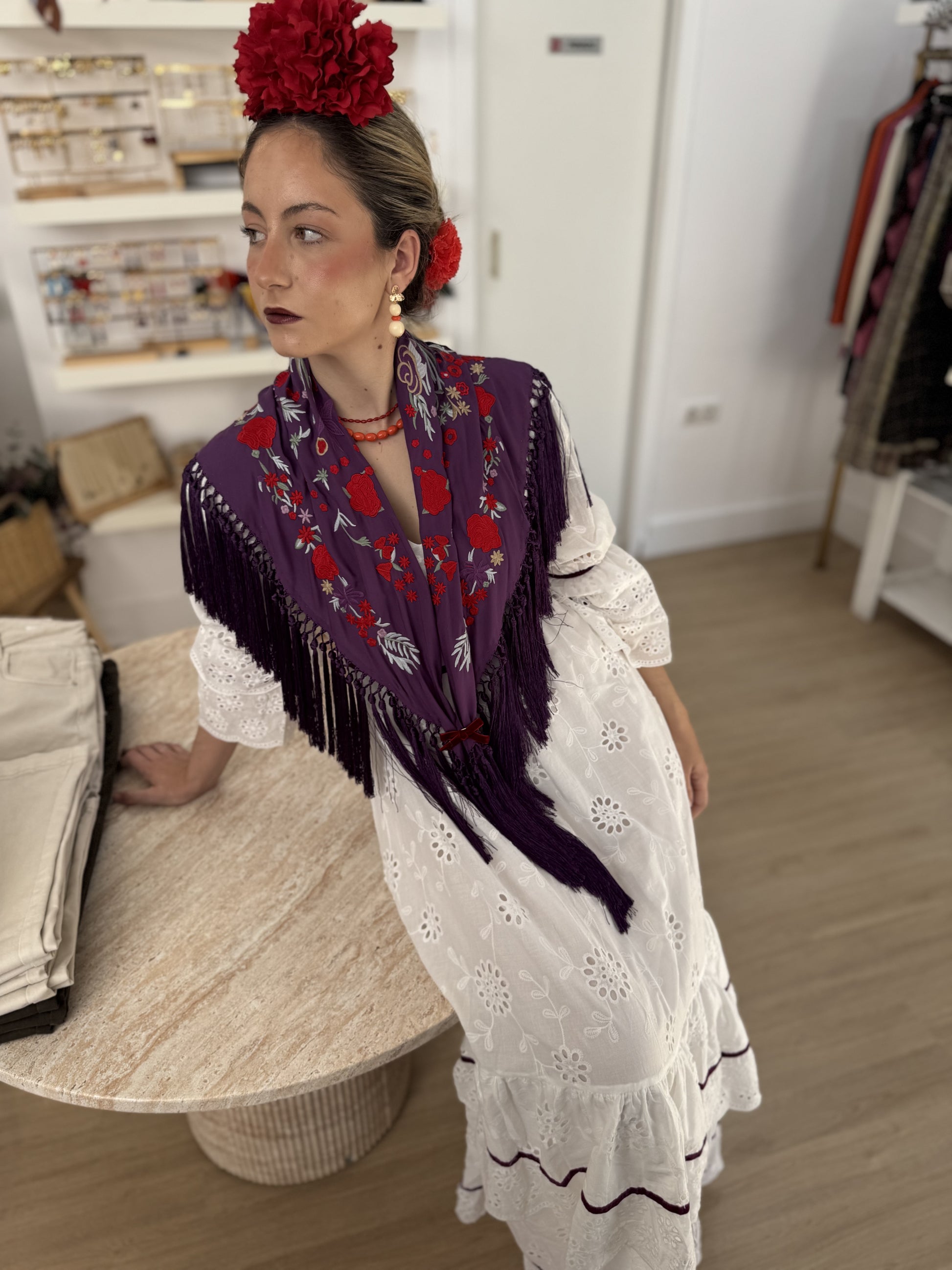 El color blanco realza su aire tradicional y luminoso, mientras que su confección cuidada ofrece una caída natural que favorece la silueta. La falda con volantes aporta movimiento y carácter flamenco, creando un conjunto lleno de gracia y elegancia.